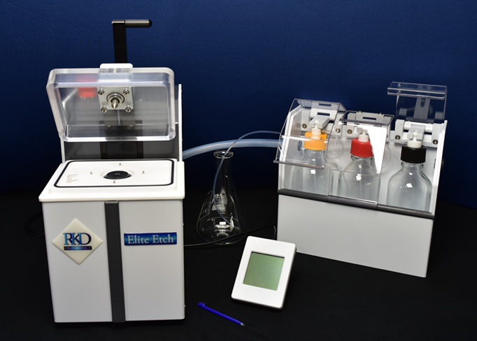 The Elite Etch from RKD Engineering is an Automated Mixed Acid Decapsulator that enables high productivity through the integration of advanced features. This new Decapsulator design rapidly and easily opens even the most delicate packages by delivering precise, micro aliquots of nitric, sulfuric, or mixes of these acids to the package with no sample damage. The RKD Elite Etch Acid Decapsulator incorporates many engineering innovations. A monolithic etch head assembly machined from premium grade silicon carbide is used for unsurpassed acid resistance. Coupled with an active nitrogen gas monitoring and purge system this monolithic design reduces the fuming of any residual acids left on the etch head after a decap process - a common problem with less sophisticated designs. Our choice of monolithic silicon carbide also enables short heat-up times.