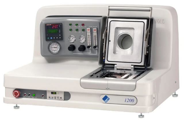 The Model 1200 is a table top vacuum and pressure furnace designed for process development and low volume production of flux-free and void-free soldered joints in microelectronic packages and components. The station is easy to use and designed for a wide variety of soldering tasks. A ramping temperature controller is combined with customized PLC's to provide automatic process control.